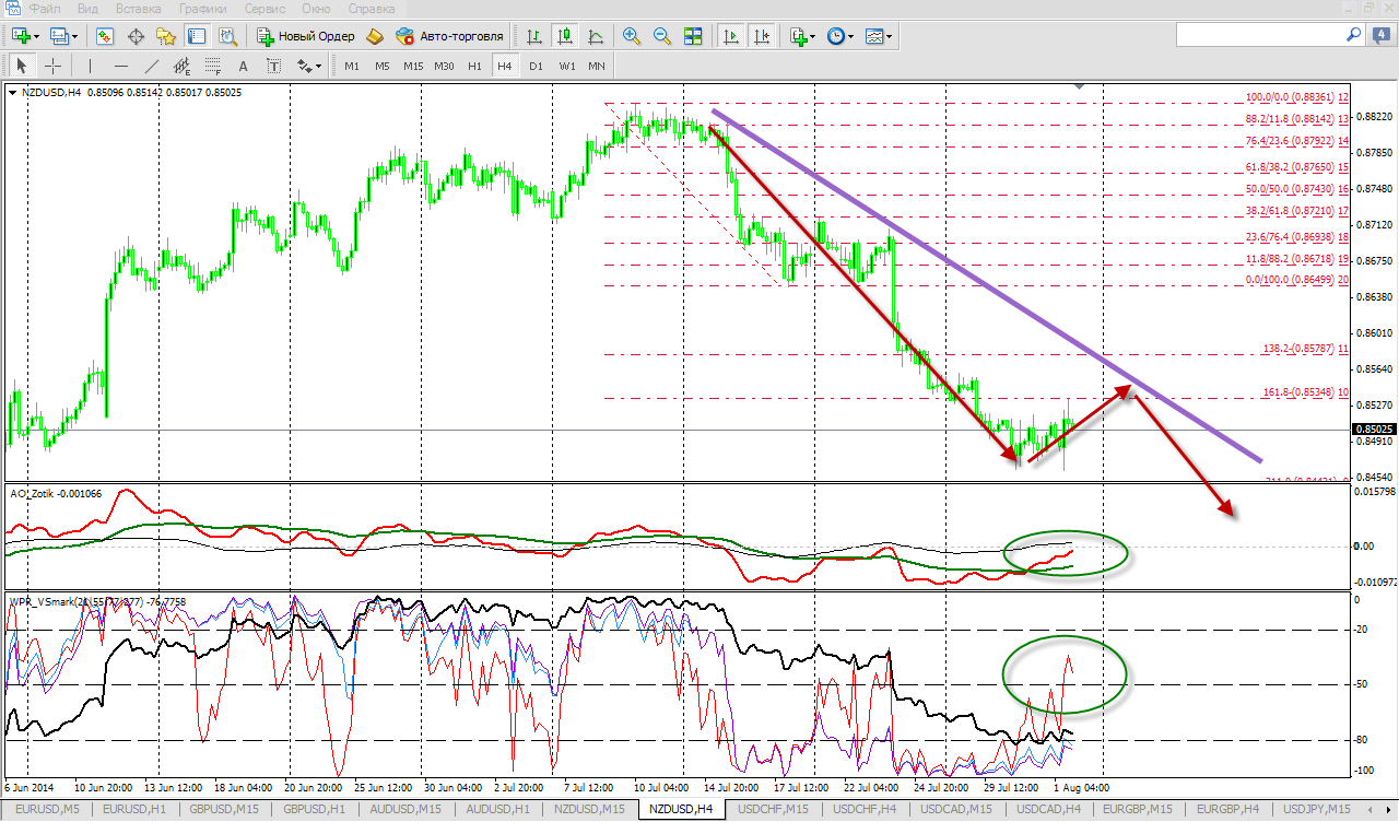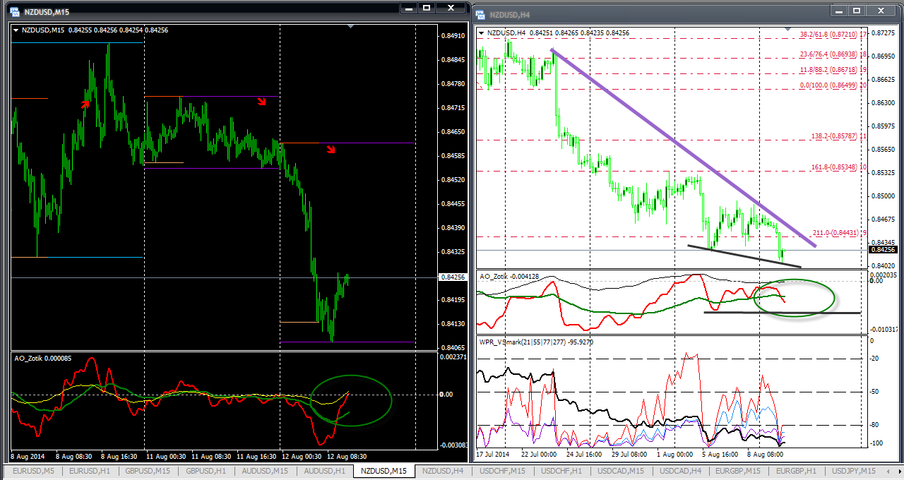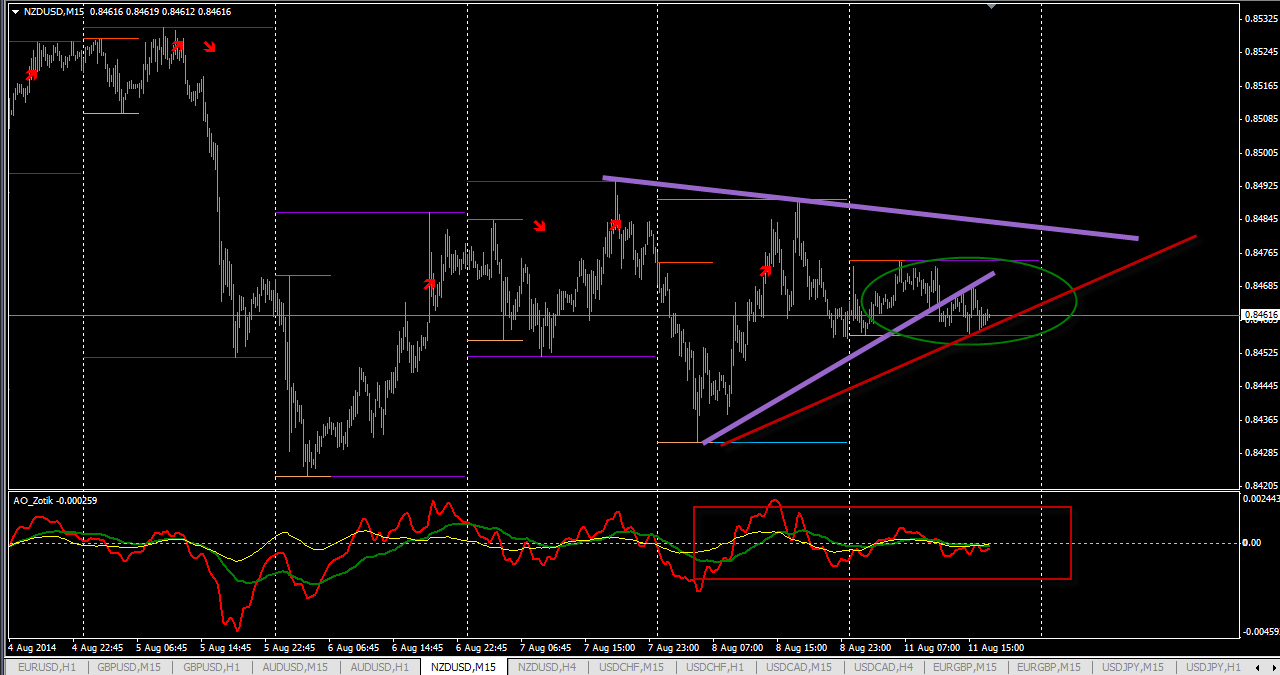 Новозеландец по-прежнему в зоне флета и сильных движений вверх/вниз не наблюдается. Также через флет была пробита бычья трендовая, рисуем новую, но и её скорее всего также пробьют. Такая ситуация, что шансы равносильны как для похода вниз(продолжения тренда), так и выхода вверх на более глубокую коррекцию. Хотя медвежья трендовая в рамках сессии ещё не тронута. АО на М15 показывает однозначно сложную структуру, повышение волнового уровня коррекции. Поэтому лучше подождать четких сигналов на вход по импульсу. А он будет после затяжного флета.