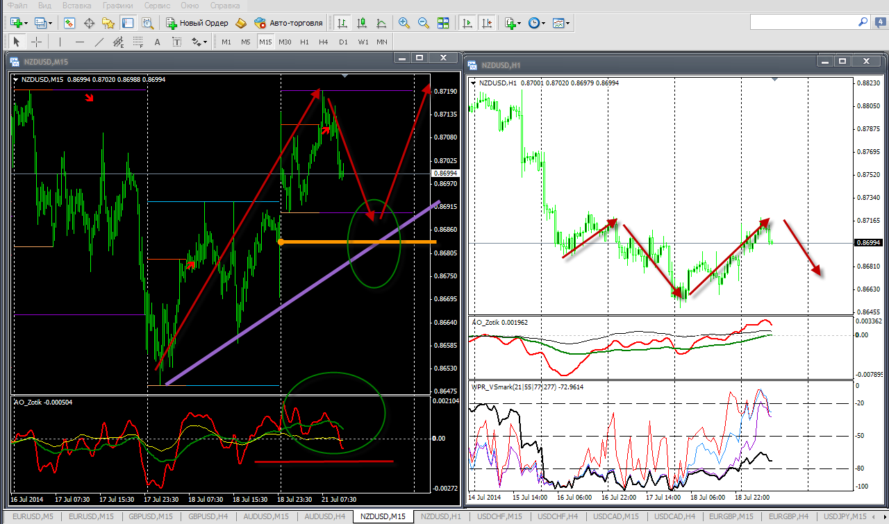 На графиках виднеется начало медвежьего тренда, но а индикаторы ваши показывают явный бычий тренд, если не пройдёт резкий разворот ценового хода. Nzd/usd хороша тем что она за день может прогуляться смело на 100-500 пипсов, и как сделать вас по богаче, так и оставить нищим. Этот инструмент нужно долго изучать чтоб он приносил прибыль, его торговать сложнее чем евро доллар, это факт