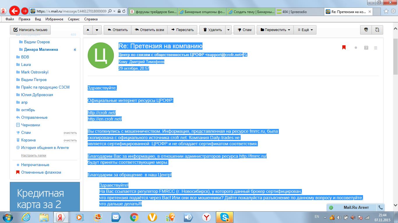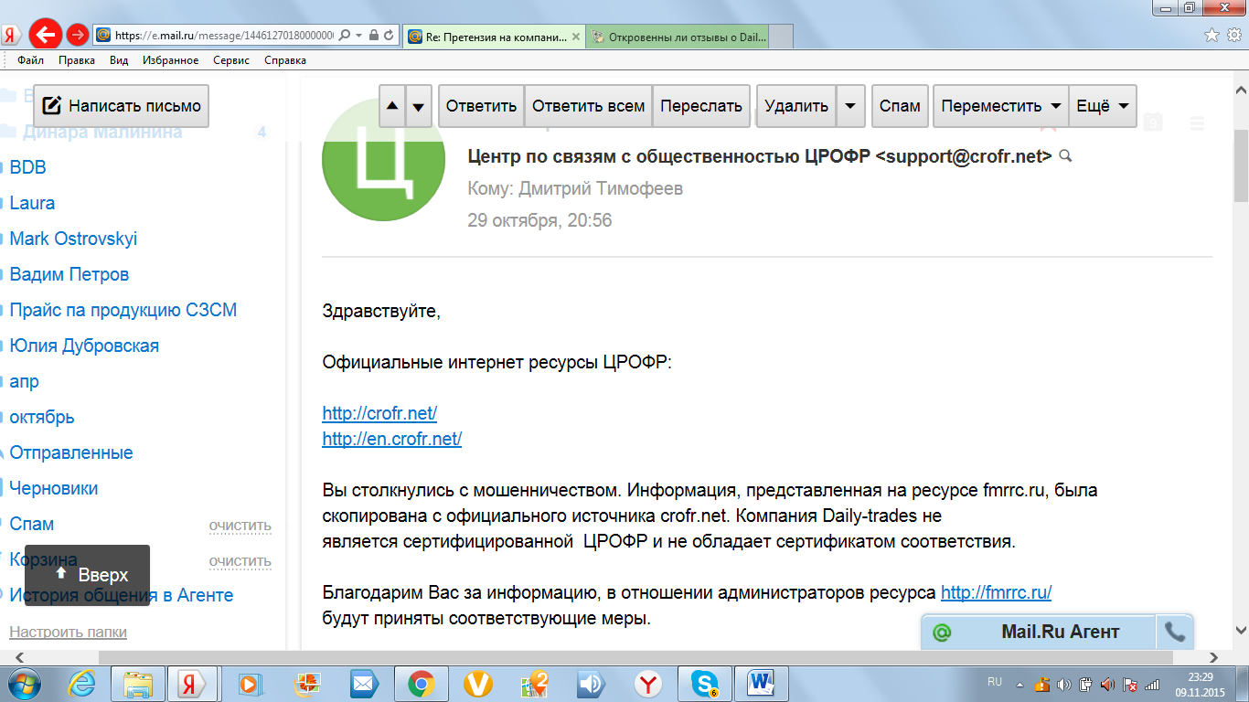 Здравствуйте! В подтверждение сказанного отправляю Вам скрин ответа ЦРОФР. Кстати, с ними можно связаться и переговорить, в отличии от "якобы авторитетного регулятора", как тут его позиционировали, у которого даже телефона нет! Сейчас ещё скрины попыток вывода отправлю и могу сделать скрины писем им и их придуманному регулятору! Кстати, в правилах форума также написано, что если мошенничество со стороны брокера будет подтверждено фактами, то он будет переведён в чёрный список! Проверьте, пожалуйста, мои факты!!! Готов предоставить всё, что попросите! Это я сейчас к администраторам форума обращаюсь! А тех, кто также пострадал от этого псевдо-брокера прошу добавить и свои скрины! Может быть совместно получится раскрыть другим глаза, чтоб не купились на дифирамбы, которые им тут некоторые поют.