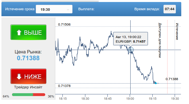 Как видите, у клиента имеется точный график котировок в центре, а сбоку условия заключения сделки. Исполняется ордер в один клик. Есть хорошие отзывы о Rbinary на счет индикатора настроений снизу - большая вероятность, что «помощь зала» сработает - проверено личным опытом.