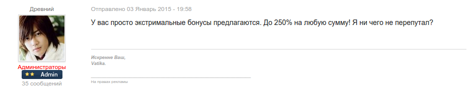 Сейчас, к сожалению, такой акции на 250 % бонуса уже нет, зато есть свой набор поощрений для разных категорий клиентов: