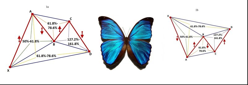 На рисунке продемонстрированная бычья модель Бабочка Гартли. Красной ломаной линией XA - AB - BC - CD обозначено непосредственной движение цены на графике. При этом AB должна составлять 50% - 61.8% от XA, BC - 61.8% - 78.6% от AB и CD - 127.2% - 161.8% от BC. В результате также отрезок XD должен составлять 61.8% - 78.6% от XA.