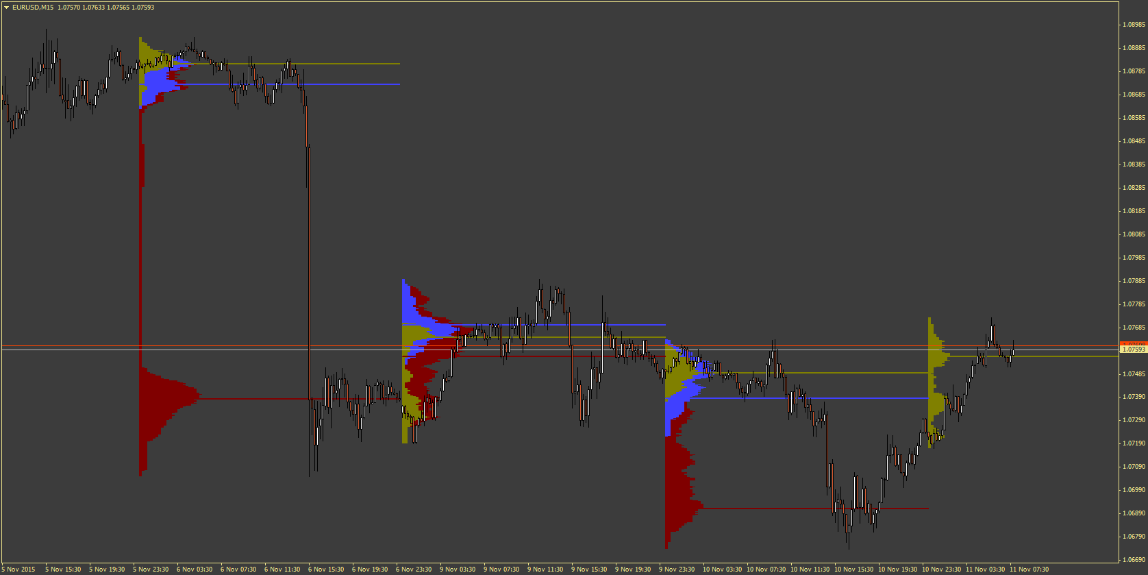 Итак. Как мы работаем по стратегии? Во-первых, нам потребуется индикатор Market Profile, который способен рисовать наторговки цены на графике. Существует три наторговки, которые связаны с тремя основными торговыми сессиями: Азиатской (желтая на графике), Европейской (синяя) и Американской (красная). Открывается Азиатская сессия – на графике вырисовывается желтая наторговка и то же самое происходит на других сессиях. Далее мы выслеживаем формацию рынка. Как видно из скриншотов – каждая сессия старается перекрыть предыдущую либо отработать некоторые уровни, которые являлись контрольными и основными за один день. Всего за день может быть три уровня (по одному на каждую сессию).Новая сессия: