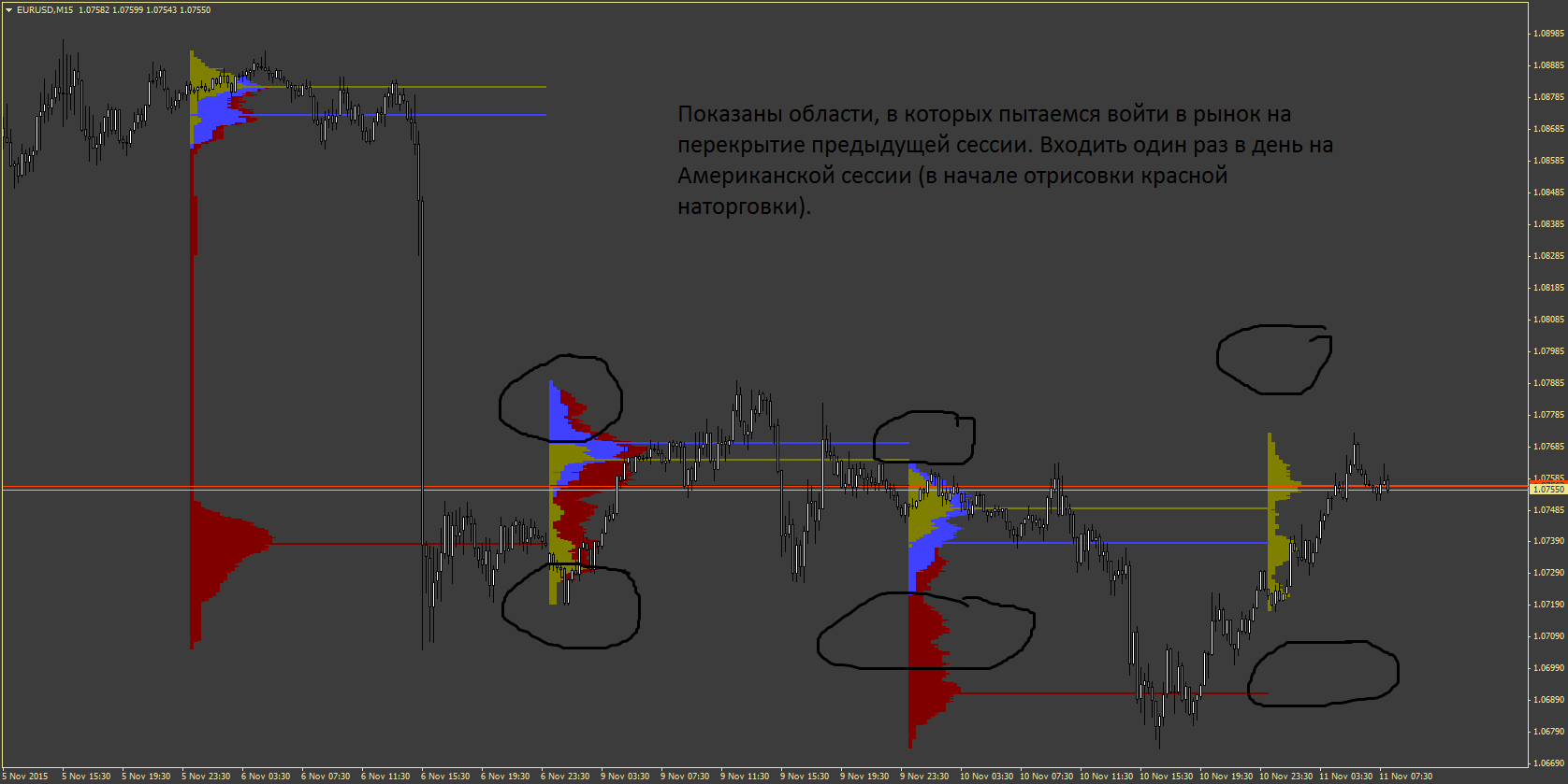 Весьма очевиден тот факт, что рынок делится на несколько торговых сессий. Пока на одной стороне нашей планеты день, то на другой неизбежно наступает ночь. Крупные банки, инвестиционные фонды, различные компании – совершают торговые операции только в рабочее время. То есть каждая торговая сессия в итоге обретает «внутренние» уровни (уровни консолидации цены, скопления объема и так далее). На каждой сессии своя формация движения. Рассмотрим порядок. Торгует Азиатская сессия, на протяжении которой цена не стоит на месте, а достигает целей, консолидируется, изменяется. На протяжении всей сессии идет отработка уровней. Но что происходит тогда, когда начинает торговать Европейская сессия? Верно. Цена неизбежно реагирует на уровни предыдущей сессии. Это основная логика стратегии работы с рыночным профилем сессии. Наша задача одна – определить верную формацию предыдущей торговой сессии. Каждая торговая сессия накладывается друг на друга. И если у нас есть данные по Азиатской и Европейской сессии, то мы сможем с высокой долей вероятность предугадать движение на Американской сессии.Вот как это выглядит на графике: