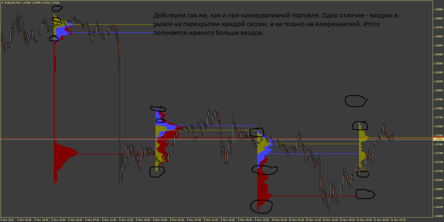 Консервативная торговля: Ждем Американской сессии. Как было указано выше, когда две сессии уже определены на графике, мы можем предположить следующее – будет ли цена перекрывать сессии либо отторговывать контрольные уровни. Следовательно, мы торгуем от краёв диапазона сессии. На скриншоте нарисованы точки входа за последние дни и таким образом действуем в последующие. Конечно, соблюдая все правила управления капиталом.