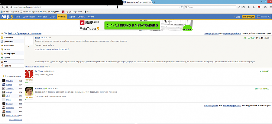 Так вот на скрине, вы видите их предложения, один программист ответил, что не все брокеры позволяют внедрить в программу робота свой браузер, я сделал запрос на брокера которого я хотел видеть в этом роботе. Жду ответа и цены.