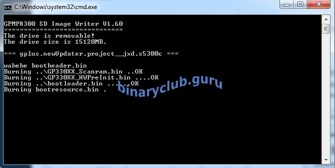 Далее из архива с прошивкой открываем папку SDImageWriterV160_only_for_s5300c_newNAND и ищем в ней программу tool.exe, и, запускаем её. В появившемся окошке, в разделе "Choose Disk", выбираем нашу флешку micro sd и жмем кнопку "Launch". Дальше ждем, пока все нужные файлы копируются на нашу карту памяти. Появиться вот такое вот окно как на скриншоте, ожидайте окончания установки фалов на флешку.