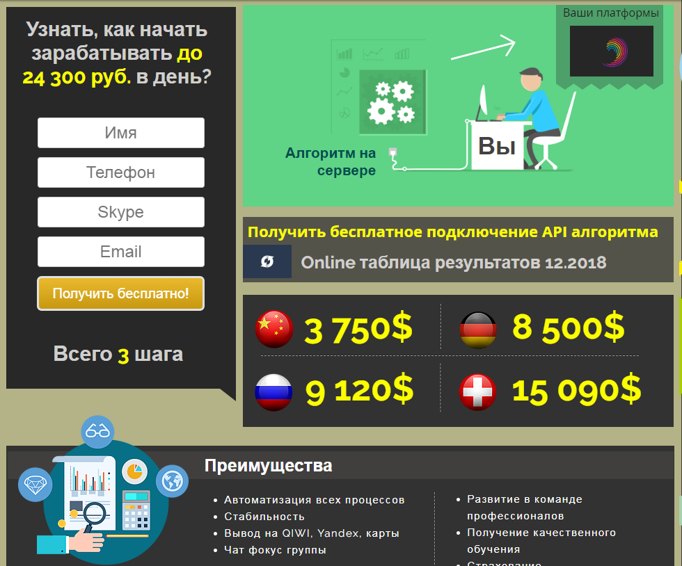 На bibsystem.info и rbt19.com никаких счетов нет, нам предлагают заполнить форму с контактными данными и подключить бесплатно торгового робота через веб-сервис API. Далее нас попросят оплатить работу робота и живого человека. Прибыль обещают высокую, в пределах 73%, что для ищущего лёгкого бабла вполне прилично. После нас начнут конкретно обрабатывать, слать ссылки на видео ролики и делать всё, чтобы лопух побольше внесли бабла. Стимуляция идет конкретная, от него неё уши трубочкой сворачиваются.