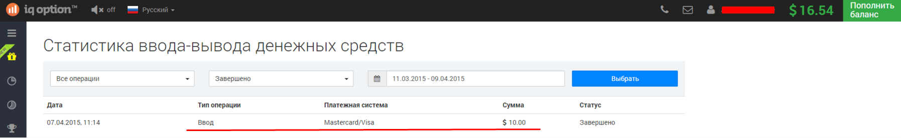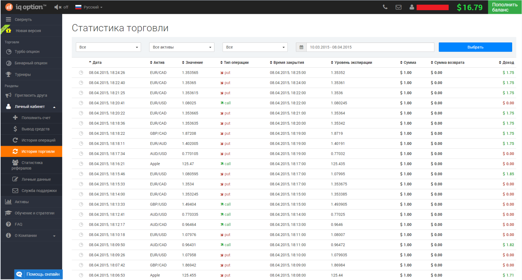 Теперь мы проверим, умею ли я торговать или нет. Привожу свою полную статистику за время торговли у брокера http://iqoption.com: