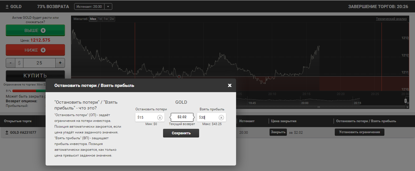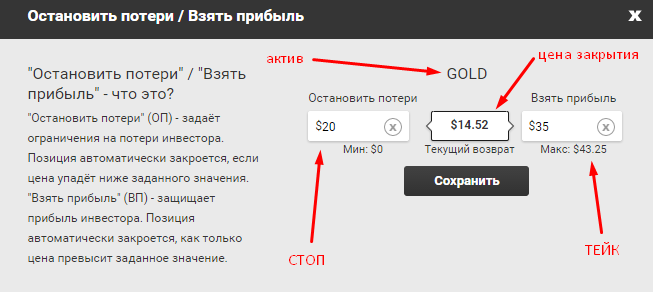 Данный инструмент по своей сути тоже самое, что и закрытие сделки досрочно (раньше времени экспирации), только исполняется он автоматически - по заранее установленным нами суммам прибыли или убытка.