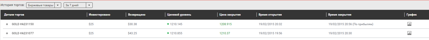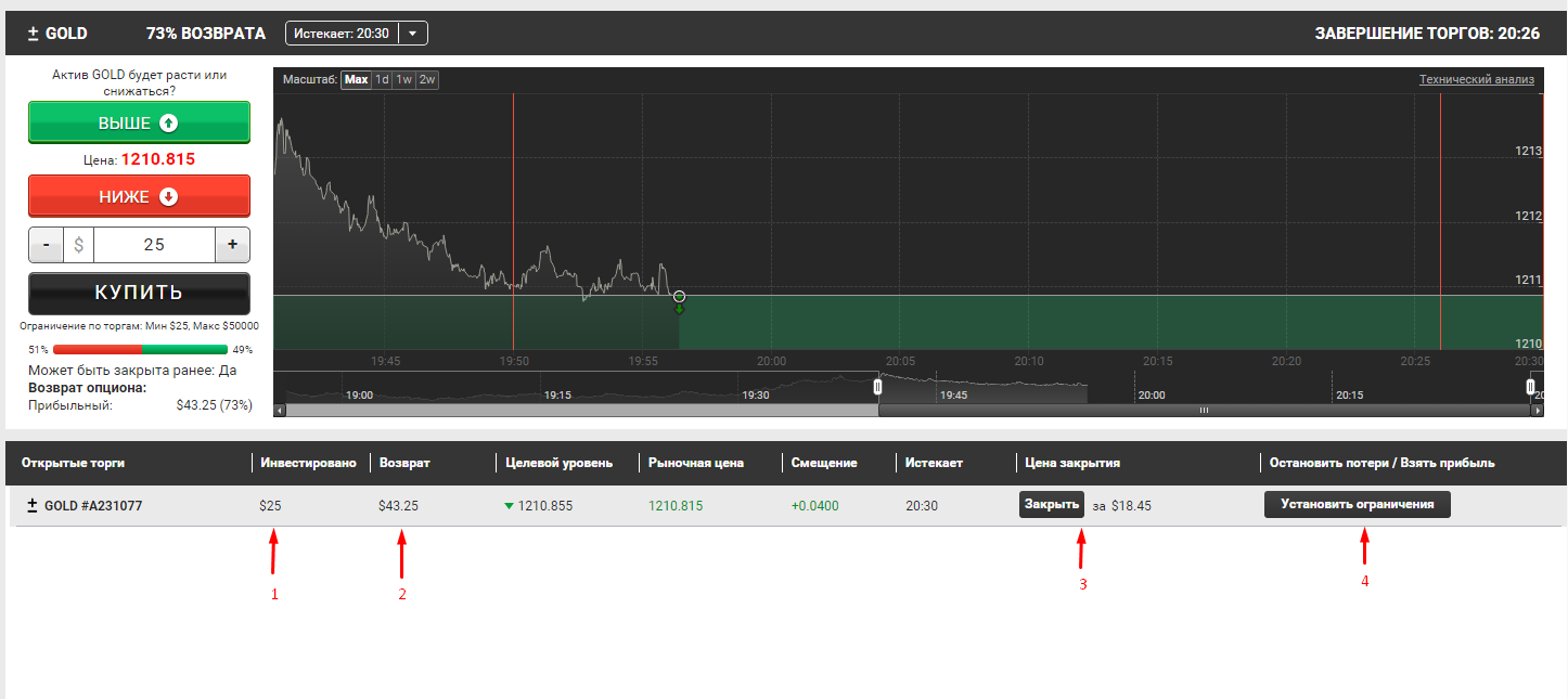 Пример: Мы открыли сделку в 25$ на понижение Золота. В графе "открытые торги" у нас появилась информация о сделке: