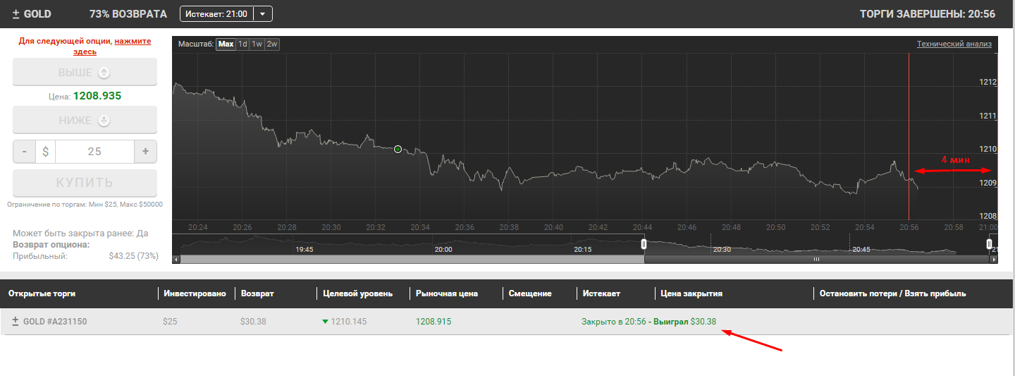 Открыл вторую сделку на понижение Золота и выставил те же значения ограничений (стоп - 15$\тейк - 30$):Как видно по следующему скриншоту, опцион закрылся по тейк профиту досрочно, с сумой возраста 30.38$. Читая прибыль составила 10.38$, вместо заранее определенной 18.25$. Опцион закрылся раньше времени за четыре минуты до окончания, если бы не тейк профит я получил 73% прибыли, так как я подстраховался заранее прибыль получилось чуть меньше, зато с большей вероятностью.