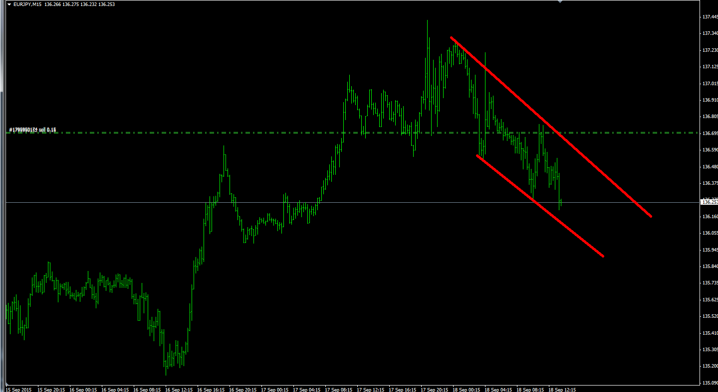 Что касается фигуры продолжения или разворота тренда треугольник то конечно использовать его в своей торговле особого смысла нет. Во первых эта фигура может быть пробита как в сторону тренда так и в сторону противоположную тренда. Во вторых как Вы правильно заметили крайне часто бывают ложные пробои и рассматривать имеет смысл эту фигуру только на старших т.ф и выше. Получается что когда одна из границ рассматриваемого треугольника пробита то шансы заработать открывшись в сторону пробоя 50 на 50. Что касается фигуры только продолжения тренда флаг, то Вы зря ее в графический анализ не включаете, так как по сути это и есть канал, который Вы видете на младших т.ф и по нему торгуете. К примеру сейчас по валютной паре евро доллар можете просмотреть на дневной графи и увидеть там явно выраженный восходящий канал к верхней границе которого сейчас растет цена по паре евро доллар, но на недельном графике этот канала отображается в виде флага и сигнализирует о продолжении долгосрочного нисходящего тренда. Вообщем я так понимаю если провести графический анализ в данный момент по валютной паре евро доллар на дневном и недельном графике то идеальным входом на продажу будет являться рост курса пары евро доллар к верхней границе обозначенного на скрине ниже флага. Кстати каналы не всегда нужно чертить ровно по экстримумам если канал равноудаленный как сегодня получился по валютной паре евро иена когда можно было сработать на опережение и продать пару евро иена от верхней границы указанного на графике нисходящего канала.