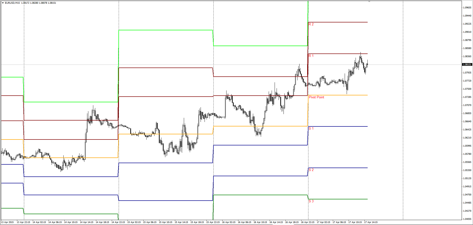 Нужно отметить, что уровни Пивота являются динамичными и рассчитываются при открытии каждой дневной свечи. Индикатор, реагируя на эту отправную точку, формирует «лесенку» сопротивляющих и поддерживающих уровней, которая будет служить приблизительным ориентиром для трейдеров, позволяющим определить, где именно в дальнейшем развернется цена.