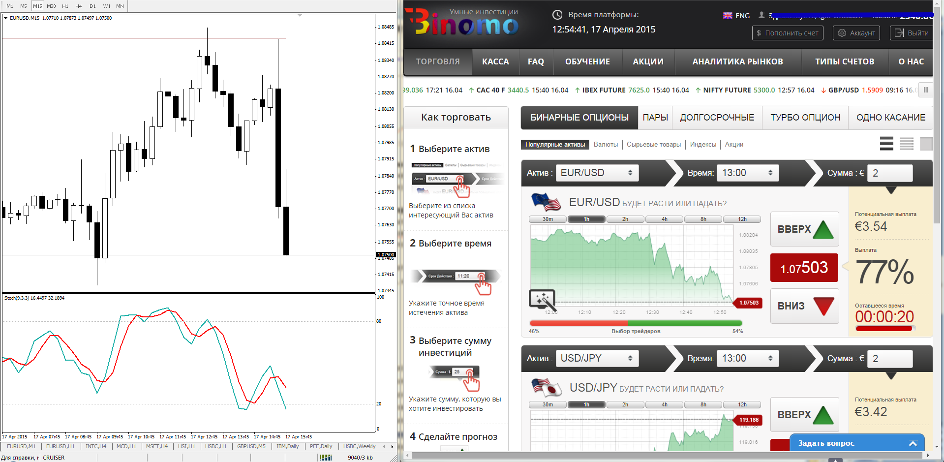 Чтобы торговать было проще, установите рядом две платформы – МТ4 и терминал брокера: