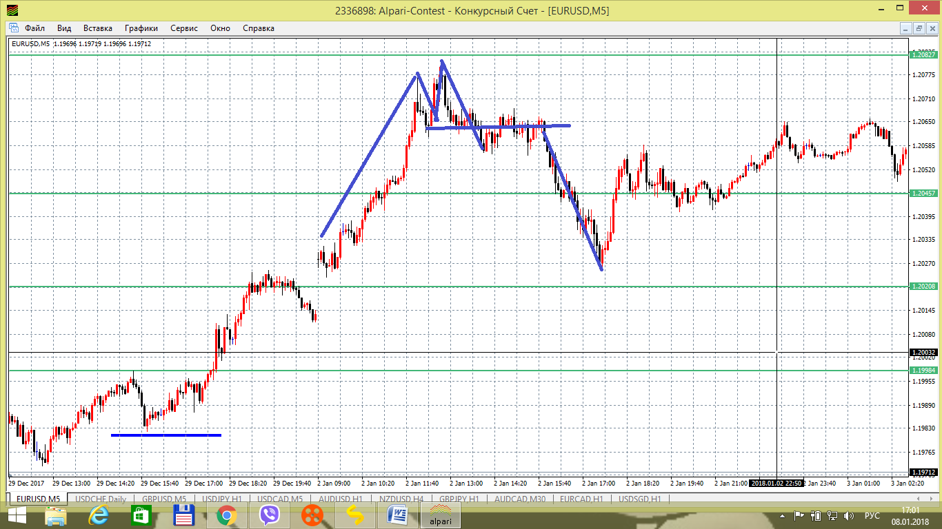 Технический анализ рынка начинается на таймфреймах H4 и H1. Свечной анализ и нахождение точки входа в рынок происходит на M5.