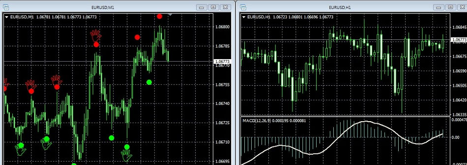 1. На М1 технический график индикатора Chaos Signal сформировал сигнальную точку разворота котировок красного цвета;