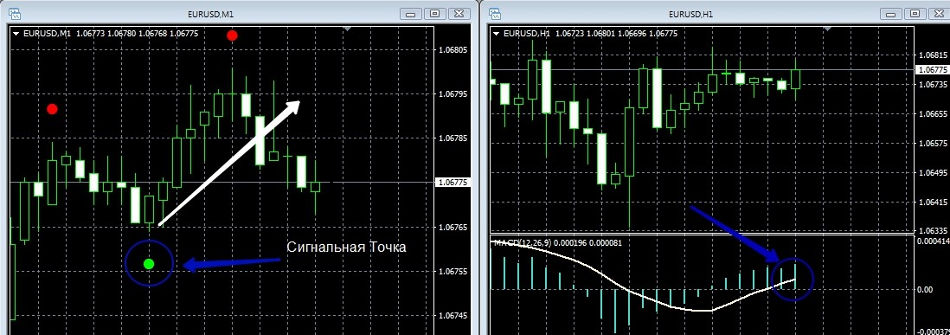 1. На минутном таймфрейме технического графика индикатор Chaos Signal сформировал сигнальную точку разворота котировок зеленого цвета;
