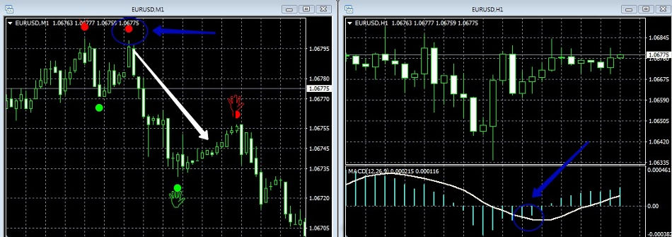 2. В этот момент на H1 графика мувинг и гистограмма индикатора MACD расположена ниже осевого уровня 0.
