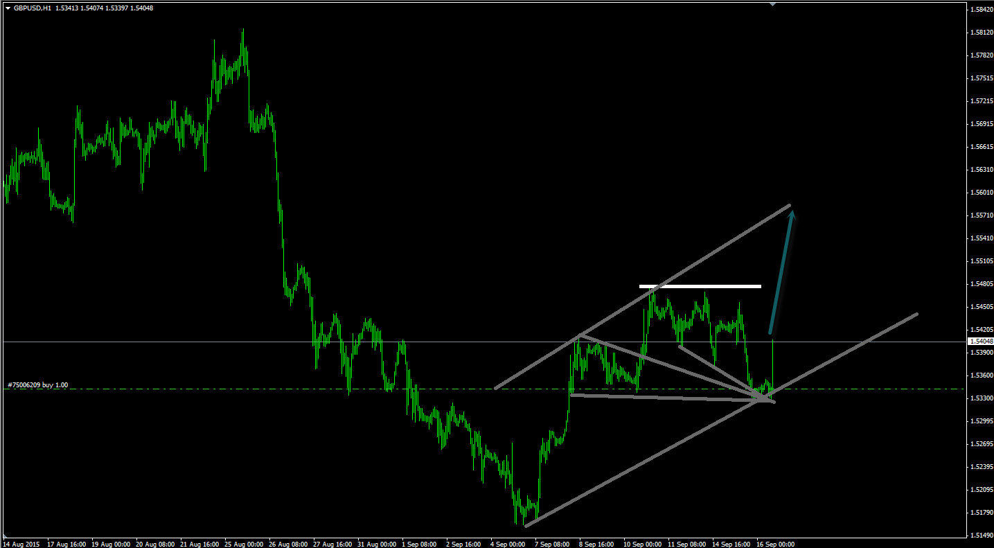 При проведении технического анализа очень важно проводить не одну линию поддержки или искать одну какую либо графическую фигуру сформированную на анализируемом таймфрейме, а искать несколько уровней, наносить несколько линий связанных по экстримумам и таким образом определять хороший момент на открытие позиций как было сегодня по валютной паре фунт доллар. Как видим на скриншоте ниже пара фунт доллар отбилась от важного уровня поддержки проведенного по минимуму 1.5325 и тамже как видим сошлись сразу и линия поддержки и нижняя граница формирующегося восходящего канала. Также если проводить глубокий технический анализ представленной валютной пары на анализируемом часовом таймфрейме можно выделить пробитую ранее линию сопротивления. которую валютная пара фунт доллар протестировала на уровне разворота тренда 1.5325 о котором я писал выше. По указанному прогнозу на скриншоте ниже я сегодня сделал хороший вход на покупку валютной пары фунт доллар и это видно опять таки на моем скришноте, так что правильный именно технический анализ дает свои результаты если его хоть немного сочетать с фундаментом, который указывал еще вчера после выхода данных по Великобритании на возможный среднесрочный рост курса фунта, а соответственно и валютной пары фунт доллар.