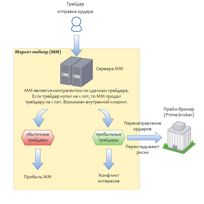 - Более солидные ММ имеют прайм-брокера, на которого могут перенаправлять убыточные ордера. При этом ММ избавляется от рисков, но не перестает зарабатывать на спреде (разнице между ценами на продажу и покупку одного и того же лота). Прайм-брокерами выступают крупнейшие банки или большие брокерские фирмы.