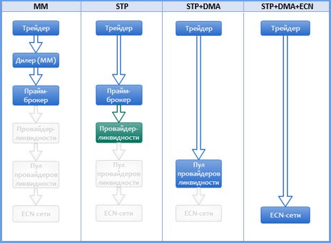 Основные схемы брокерской работы зашифрованы в аббревиатурах DD, MM, NDD, ECN, STP, DMA. Их нужно понимать и уметь отличать друг от друга, т.к. многим такие значения не понятны, а многие на них даже не обращают внимание, но данная информация будет полезна многим. И так начнем.