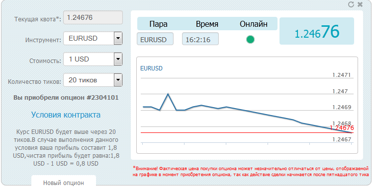 Да просто на старших т.я смотрю как движется цена какая свеча формируется на 5 - ти минутном графике. Если это тренд нисходящий и идет серия из медвежьих свечек то естественно тиковый опцион на понижение курса открываю, а щас вот по евро к примеру у меня открыт тиковый опцион на повышение курса так как курс евро доллар вероятней всего по моему анализу достигнет максимума сегодняшнего дня у 25 фигуры, конечно 20 тиков редко когда ставлю в основном 50-100 тиков.Yurbol писал(а):Если честно, то я не представляю как можно на тиковым графике торговать бинарниками. Нету же ни каких сигналов на тиковым графике для входа в рынок, или же вы может знайте какую либо торговую ТС для торговли на тиковом графике? Как мне кажется, само логично и безопасно покупать ордера от часа, а лучше всего от дня. На дневном лучше всего входить в рынок. Входите с утра, и закрываете опцион в 00:00. И никогда не словите случайных откатов или коррекций как к примеру на часовом или на 4-х часовом.