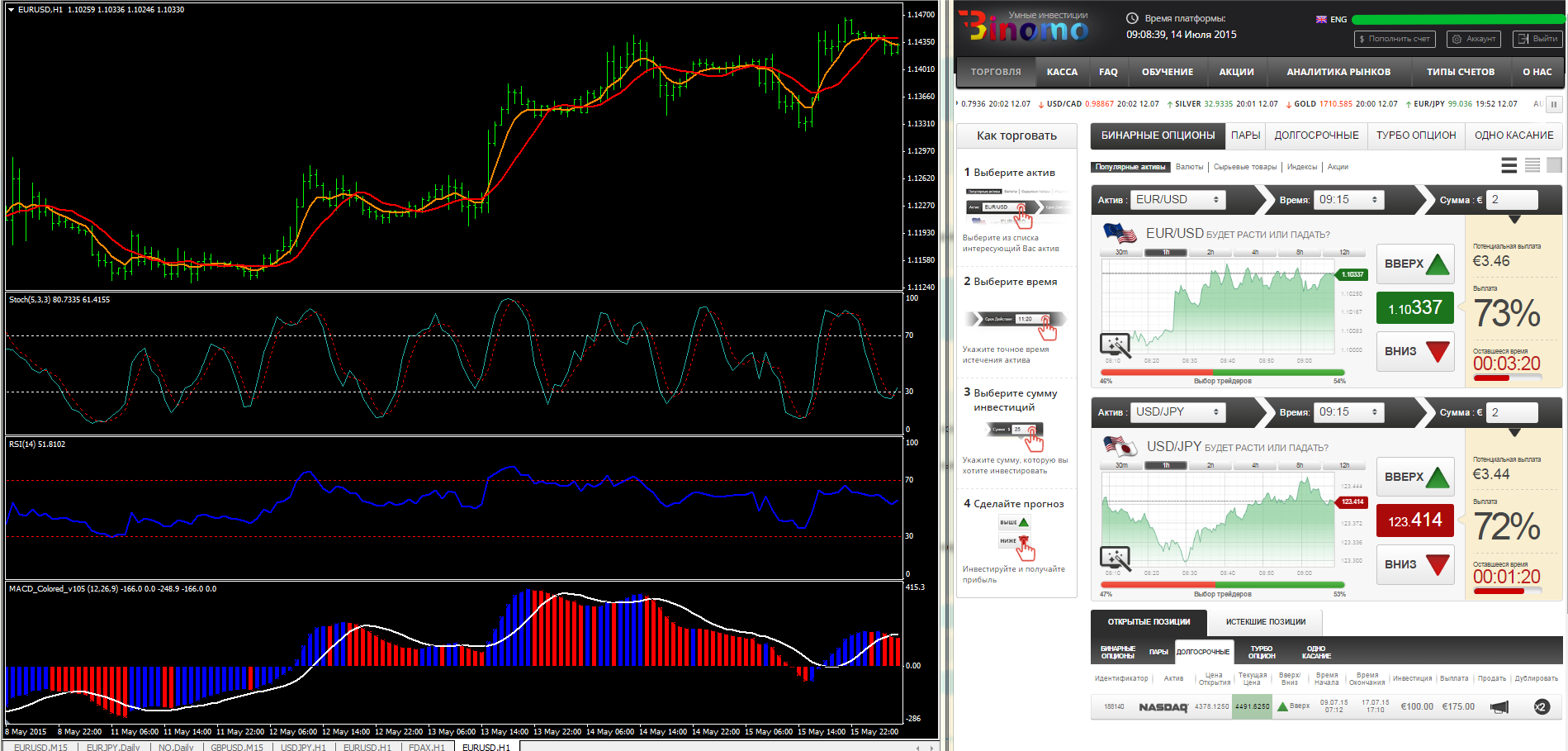 Теперь поставим платформу с таким вот интересным графиком котировок рядом с окном платформы брокера Binomo. Так торговать будет намного удобнее:
