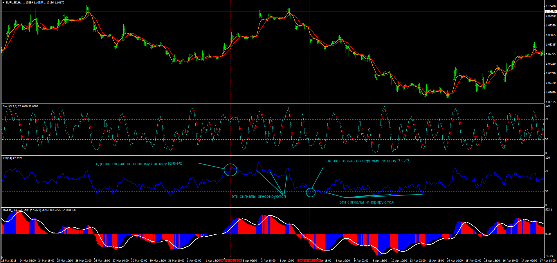 Таким образом, мы будем входить только в самом начале волны роста или волны снижения, а повторные сигналы, которые получаются все слабее и слабее, мы игнорируем.