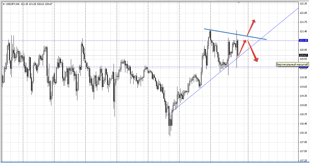 Мы наблюдаем, как пара пытается пробить трендовую линию вниз Сверху мы успешно отскочили от сопротивления 121,15. Нам не удавалось пробить этот уровень уже ни один раз. Внизу нас ожидает серьезный зеркальный уровень 120,30. Важно отметить, что на Н4 образовался треугольник. Ждем пробоя!