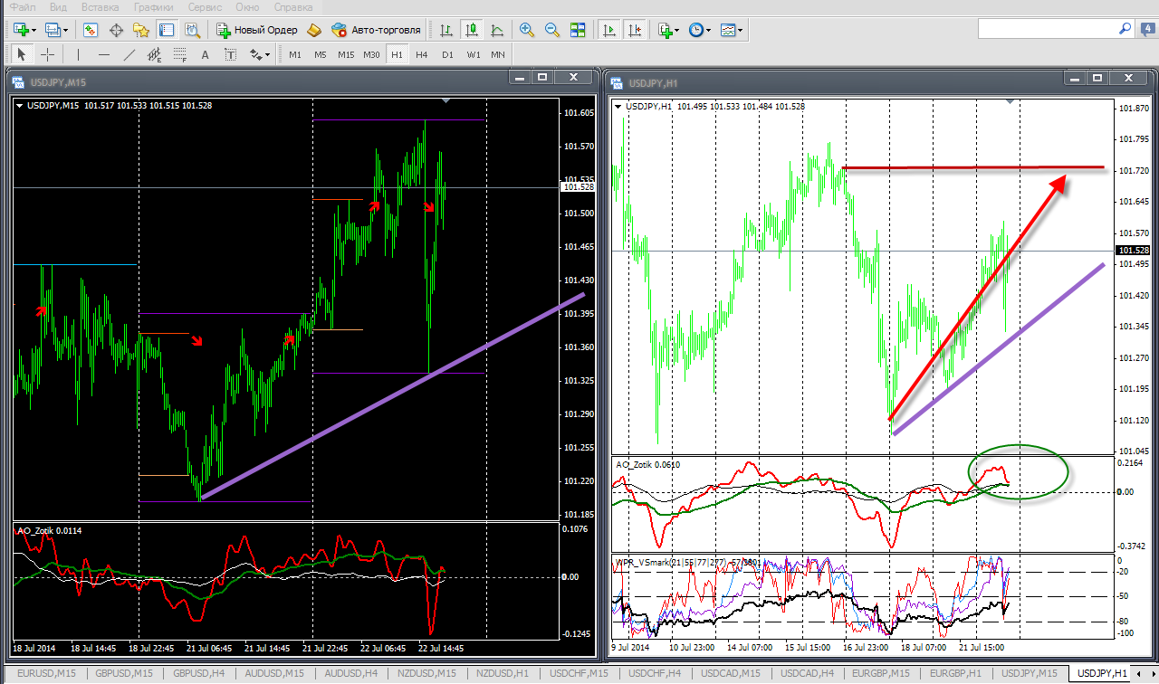 По йене, несмотря на сильный шип вниз, пара продолжает восхождение, хоть и слабое виду отсутствия драйвера. Даже сумела обновить хай, который на старшем ТФ был хорошим сопротивлением, но нет закрепления выше этого уровня. Также не ушли ниже отметки 101,20, а это пока есть хорошо. Вполне вероятно, что на фоне укрепления доллара, пара и далее продолжит восходящее движение вплоть до отметок 101,70-80. Оттуда уже можно при наличии сигналов снова продавать.