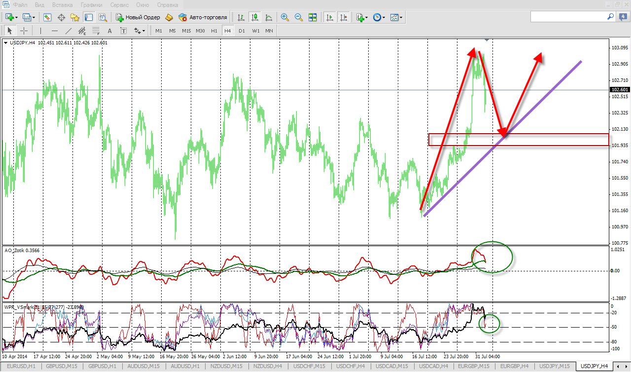 по валютной паре доллар-йена на графике Н4 видим пока только формирование двухфрактальной свечи на лоу , пока нет 3й справа , но тело свечи самой очень большое и не тянет на разворотную , пока дорабатывается сигнал вверх на Н1 и вполне можно ожидать достижения диапазона 102.69-102.77 , откуда цена должна развернуться вниз , посмотрим.