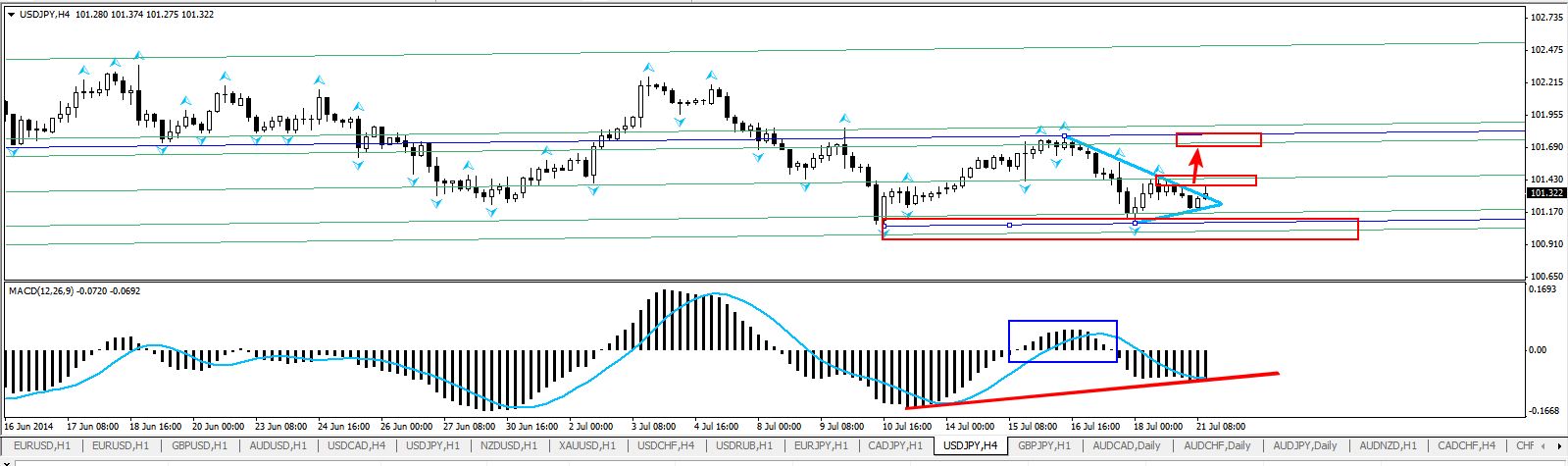 По паре USD/JPY на 4-х часовом тайм-фрейме вполне вероятно формируется фигура двойное дно, где имеет потенциал импульcной волны роста на покупку, целевые ориентиры для покупок рассматриваю главный приоритет уровня 101.700, но также для импульсного движения требуется пробить уровень сопротивления отметку 101.450 и затем уже к цели 101.700 также стоит отметить что индикатор MACD указывает на условный рост гистограмм, что говорит о вероятности также движения к повышению.