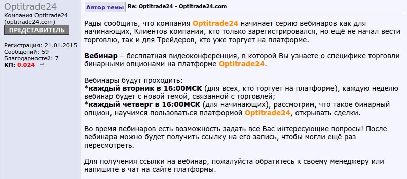 Что касается обучение, отзывы о Optitrade24 этого плана никогда не были особо выразительными - обучающие программы стандартные. Единственное, что недавно брокер запустил вебинары для клиентов: