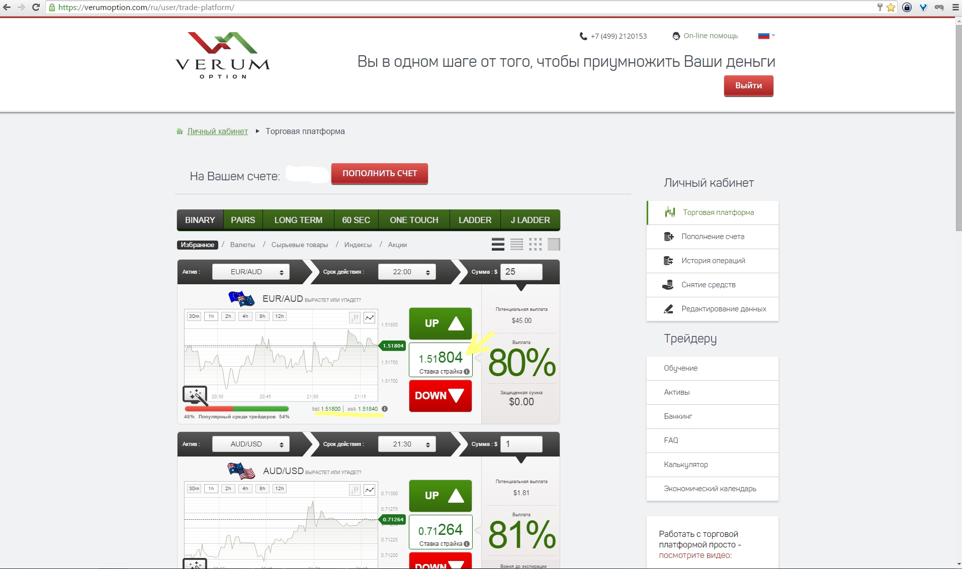 Для тех, кто не знает, торговля опционами очень проста: вам нужно выбрать в какую сторону пойдет график котировок: вверх или вниз. Возможная сумма прибыли будет известна заранее. В случае со стандартными бинарными опционами это фиксированная плата до 90 %.